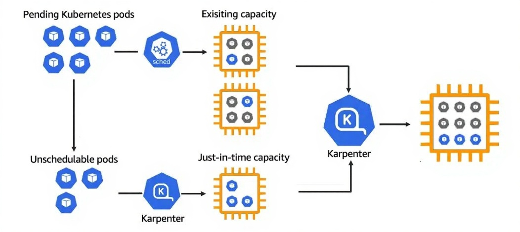 Karpenter 是一个开源的弹性伸缩方案,它提高了 Kubernetes 集群的可用性,为应用程序提供类型和大小最适合的计算资源。其工作流程如下图所示: