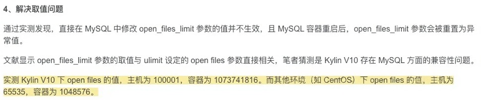 Docker 守护进程通过 docker.service 文件的 LimitNOFILE 参数限制容器的 open files,笔者在安装 Docker 时使用了 LimitNOFILE=infinity 这个默认配置,导致 Kylin V10 下容器取值为 1073741816(笔者猜测由于系统特性,Kylin V10 与 其他操作系统对应的 infinity 换算方式不同),因此问题的解决方法也可以如下: